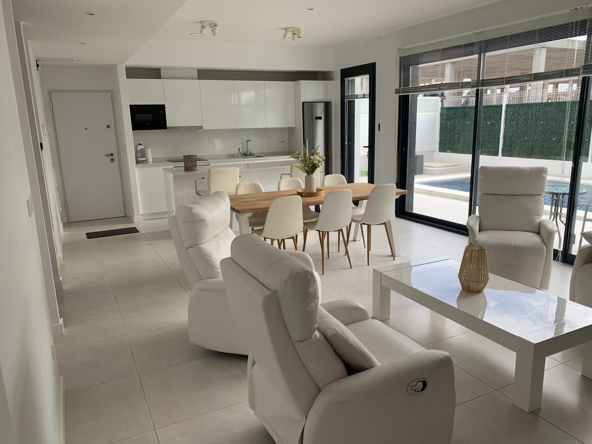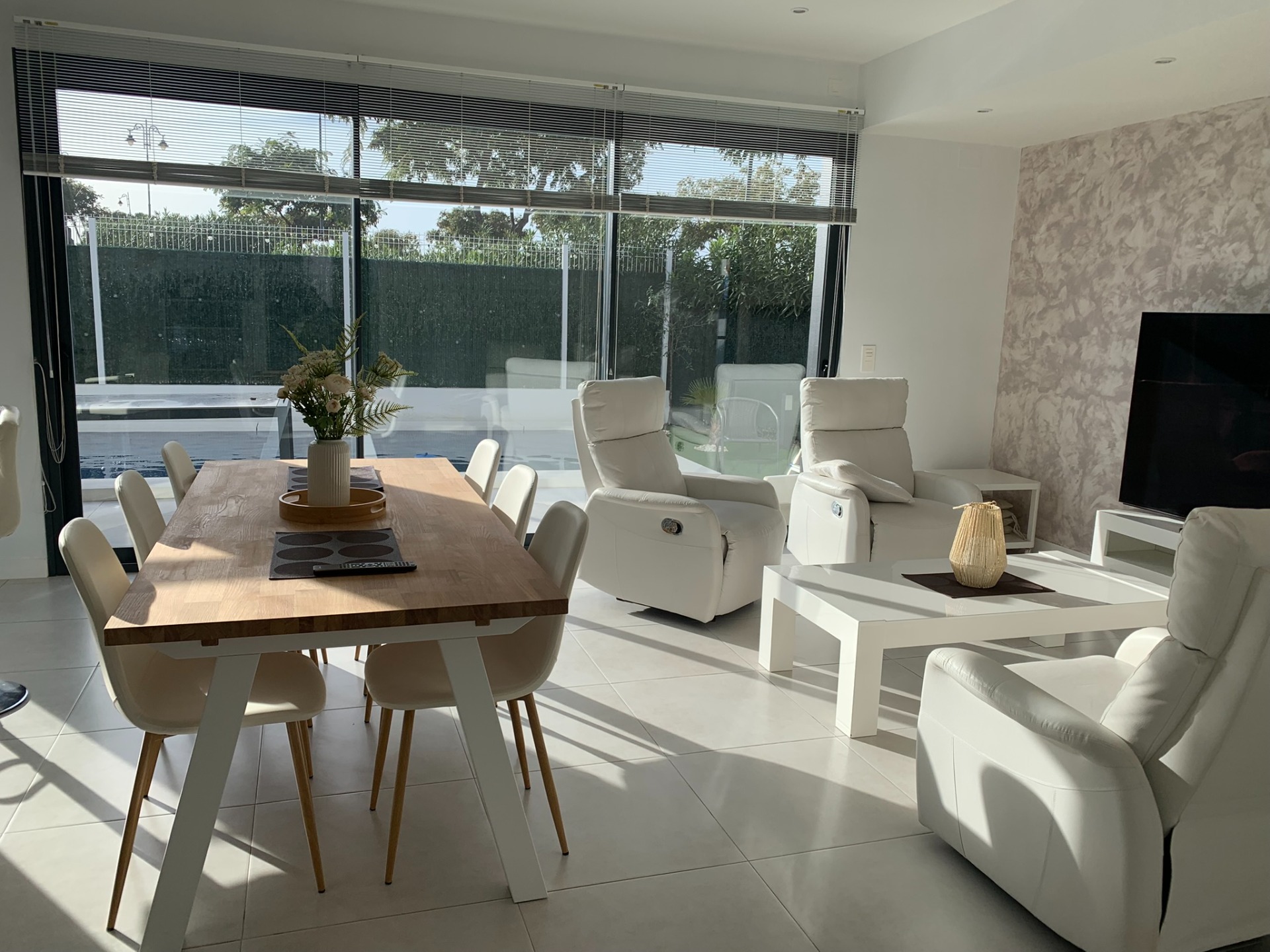 living met zonneluifels en jaloezieën, eettafel met 6 stoelen, zetels, televisie, AIRCO en WiFi in heel de villa