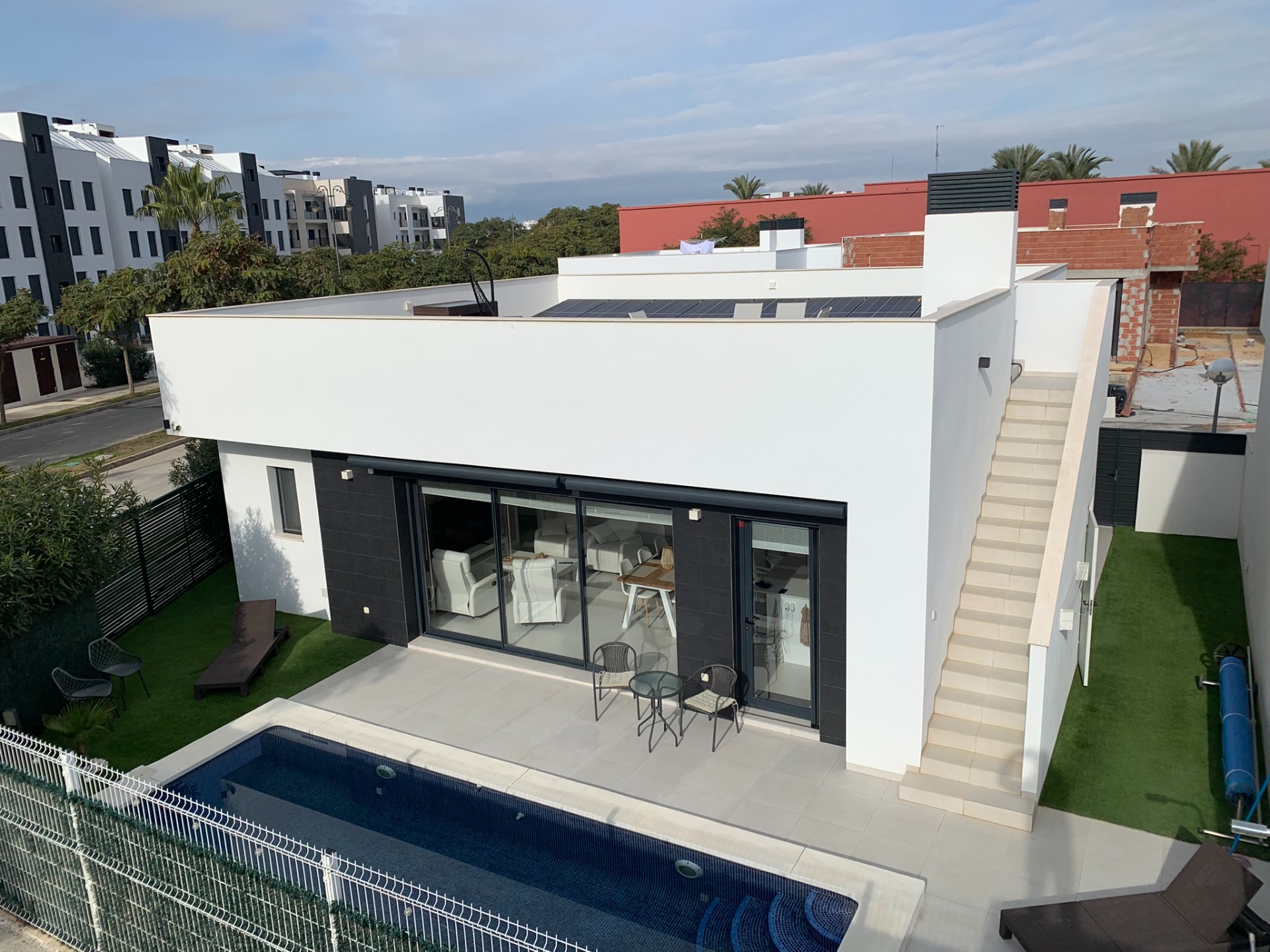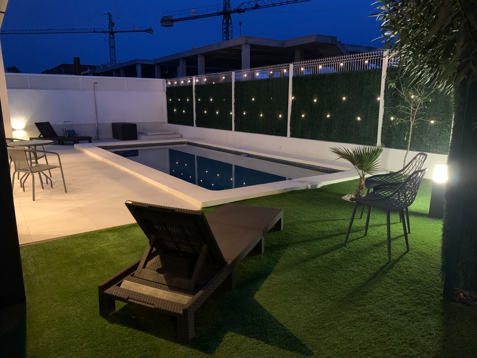 groot privé zwembad met trap, veilige verhoogde rand, voorzien van ligbedden, schaduw van 2 elektrische luifels en bomen
