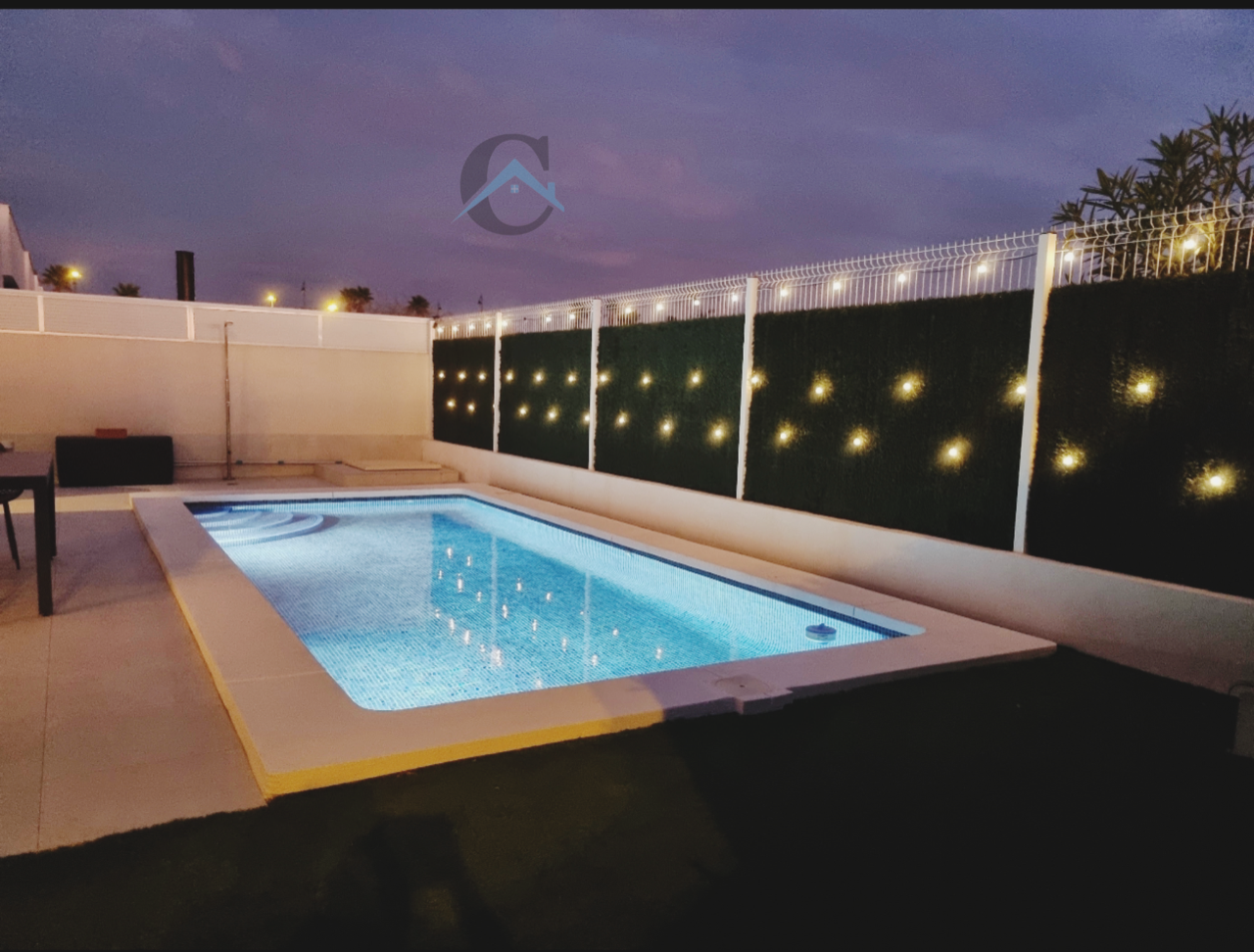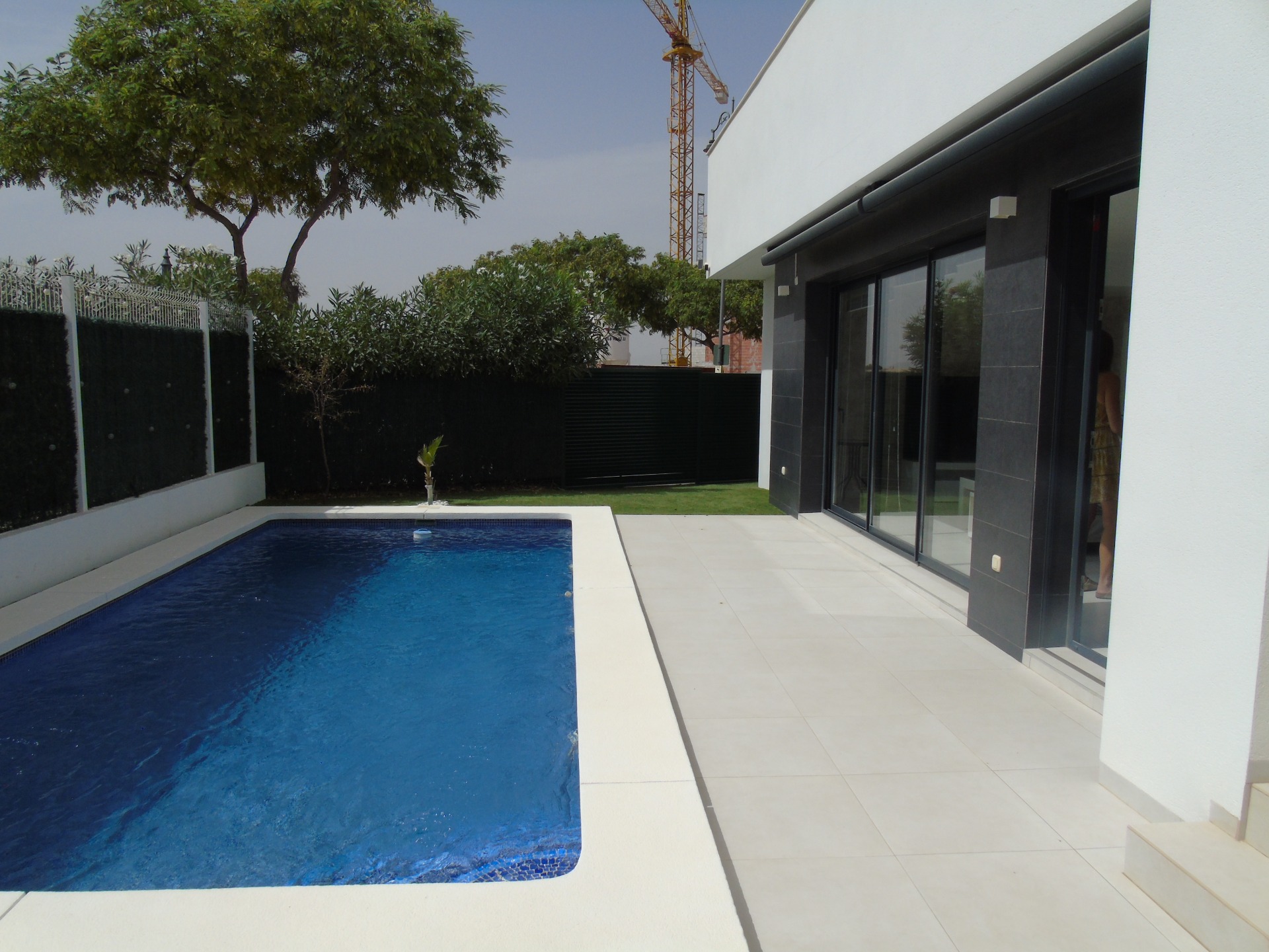 groot privé zwembad met trap, veilige verhoogde rand, voorzien van ligbedden, schaduw van 2 elektrische luifels en bomen