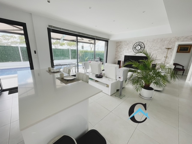 living met zonneluifels en jaloezieën, eettafel met 6 stoelen, zetels, televisie, AIRCO en WiFi in heel de villa